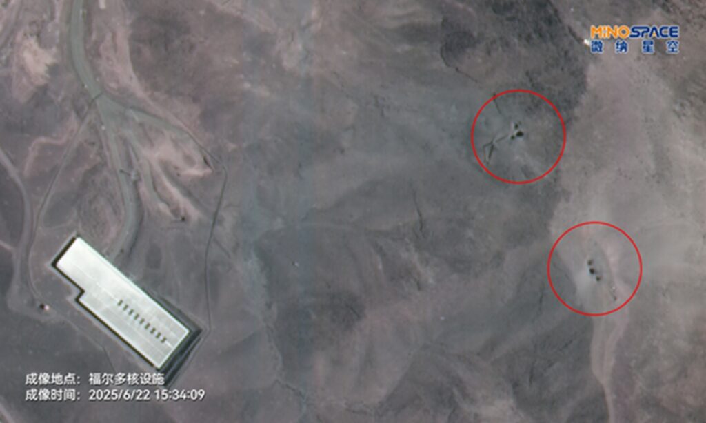 Satellite imagery of the Fordow nuclear facility after U.S. bunker-buster strikes on June 22, 2025. The series of impact points and disturbed terrain suggest targeted penetration of underground entrances.